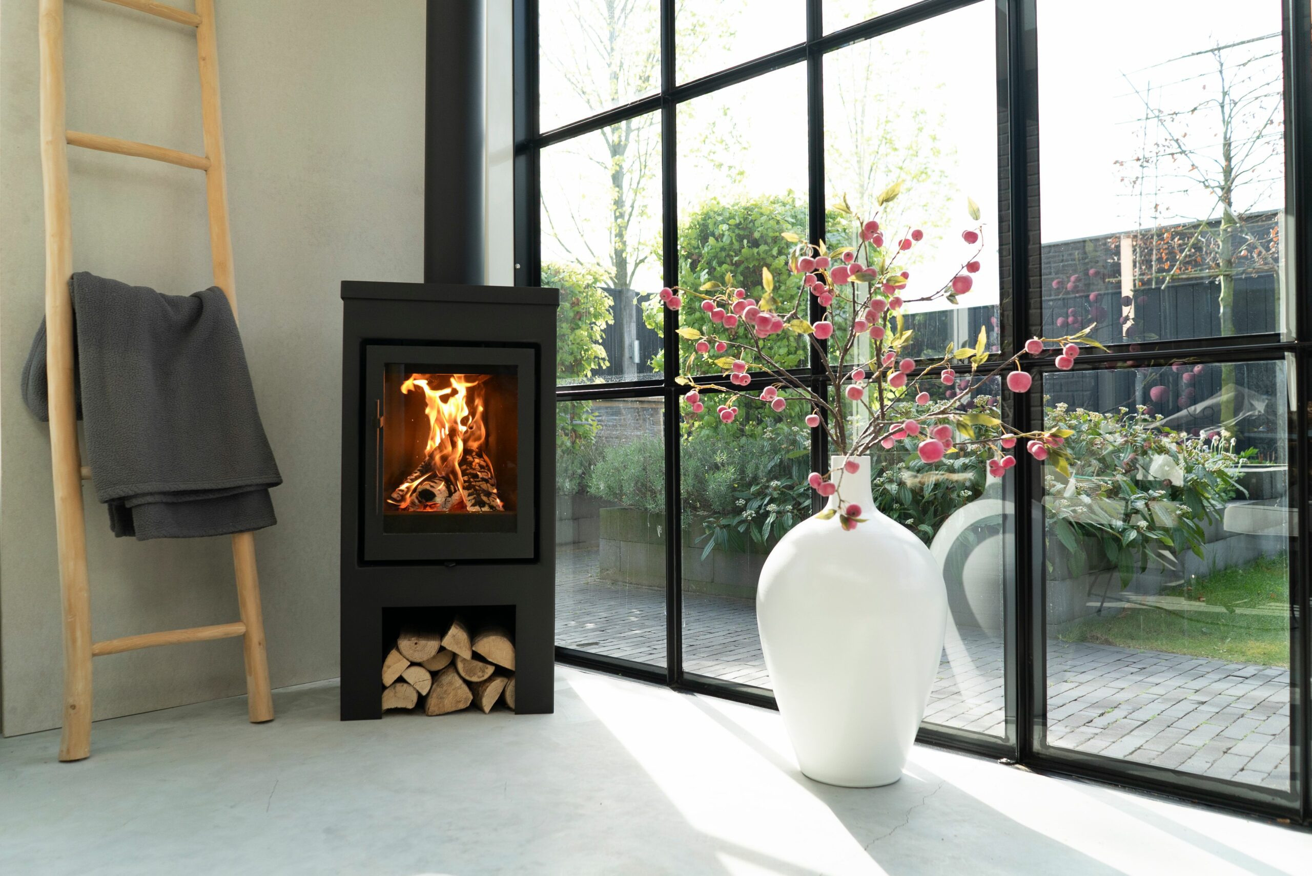 Het grote venster geeft een unieke belevenis op een dansend vlammenspel waar je warm van wordt.